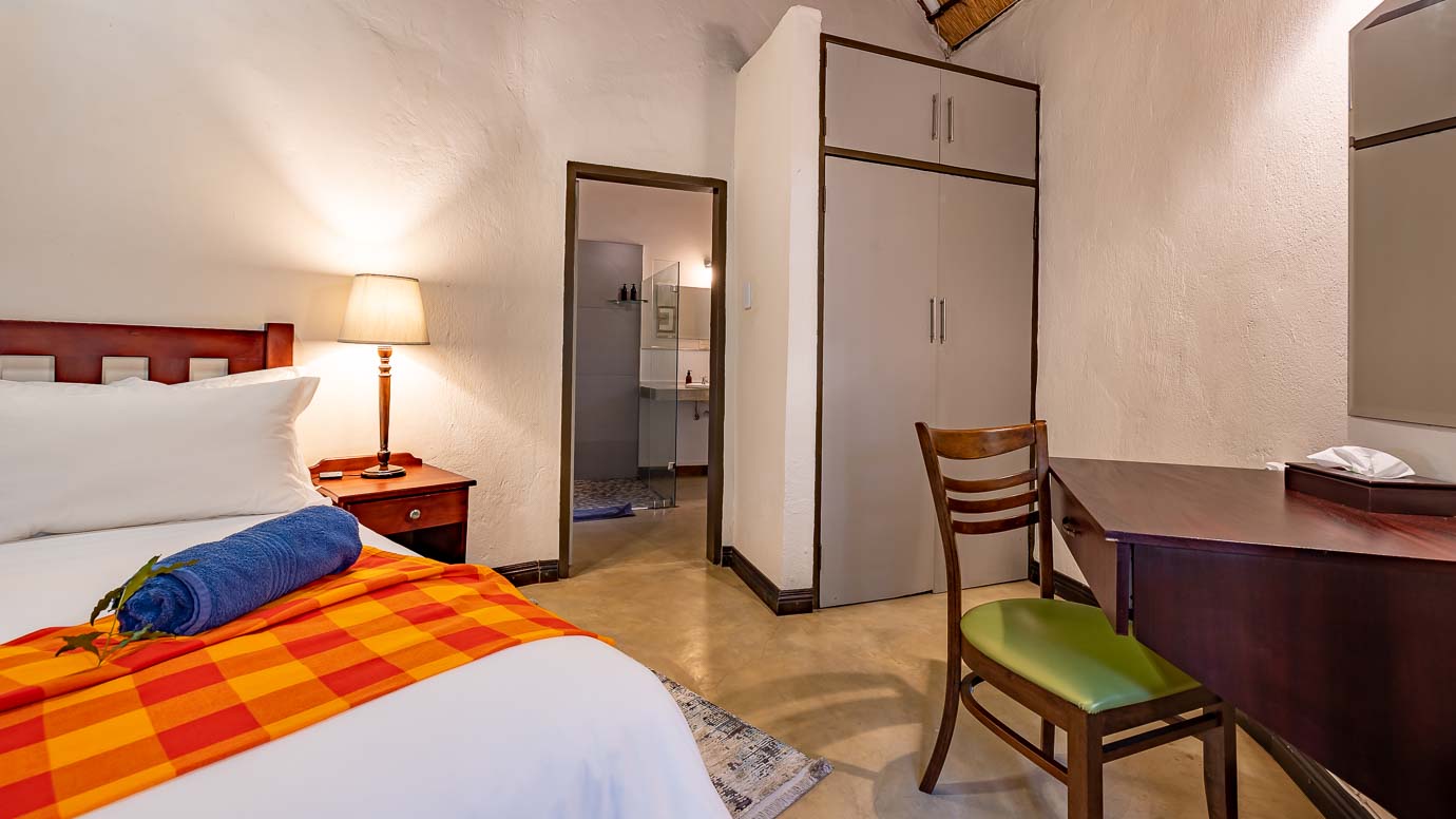 Two of our oldest villas based on the typical hunter’s lodge design. Two bedrooms en suite offer space and comfort to our guests. Thatched ceilings add to the nostalgia of the past creating an old-world charm. Nyala buck often frequent the lawn grazing during the day. A large private pool offers a tranquil setting for relaxation.